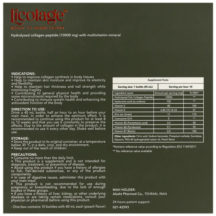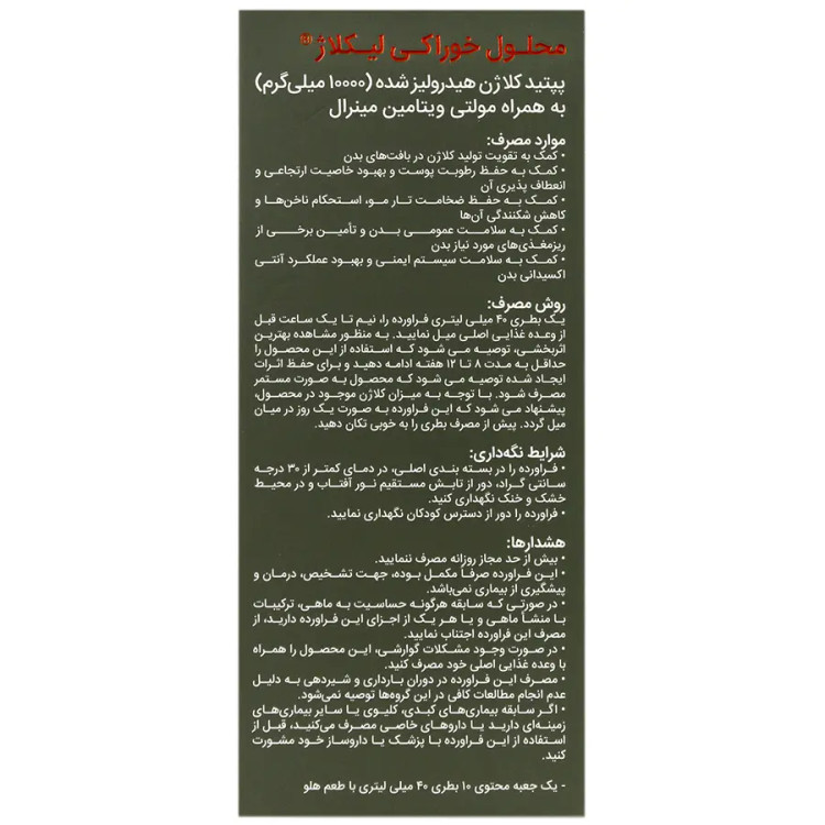 - لیکولاژ محلول مایع خوراکی مولتی ویتامین مینرال حاوی پپتید کلاژن هیدرولیز شده و هیالورونیک اسید