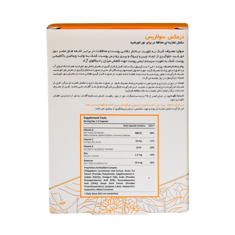 درمکس سولاریس مکمل تغذیهای بوده و جهت تشخیص، درمان و پیشگیری نیست.