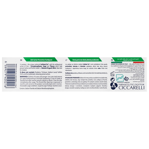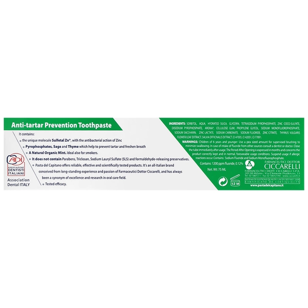 درباره محصول : خمیر دندان ضد جرم سیگار پاستا دل کاپیتانو، حاوی عصاره نعنا و مریم گلی موثر در پاک سازی جرم از روی دندان ها با خاصیت سفید کنندگی خمیر دندان کاپیتانو، کمک به حفظ مینای دندان و جلوگیری از آسیب به آن بهبود بهداشت دهان و دندان به ویژه در افراد سیگاری افزایش استحکام مینای دندان با استفاده از فلوراید سدیم روش مصرف: در هر بار مسواک زدن حداقل یک نخود خمیردندان استفاده کنید.