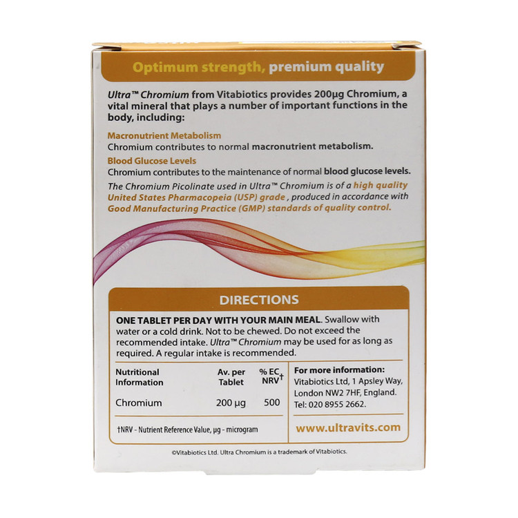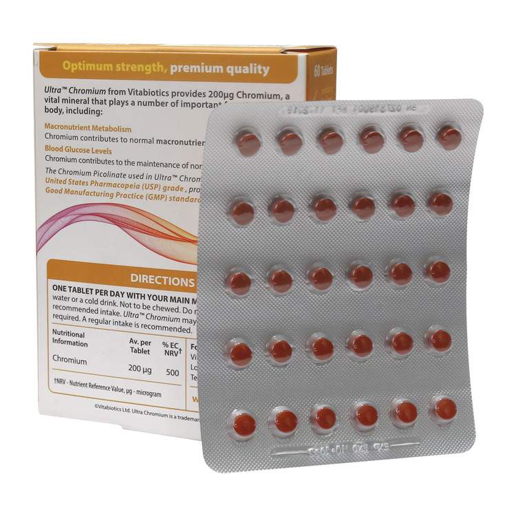 قرص اولترا کروم 200 میکروگرم ویتابیوتیکس مکملی موثر و منحصر به فرد بوده که به حفظ میزان گلوکوز خون در سطح نرمال کمک میکند. همچنین این فراورده میتواند در متابولیسم کربوهیدرات، چربی، پروتئین و افزایش حساسیت به انسولین کمک کننده باشد. کروم یک عنصر طبیعی کمیاب بوده که با تقویت عمل انسولین در متابولیسمهای ذکر شده نقش دارد. همچنین قرص اولترا کروم خواص آنتی اکسیدانی داشته و در کاهش وزن و افزایش توده عضلانی تاثیرگذار است. بدین صورت مکملهای حاوی این عنصر مناسب افراد دیابتی یا در معرض خطر دیابت، ورزشکاران، سالمندان، افراد با اضافه وزن و چاقی است. این محصول از برند ویتابیوتیکس فاقد هرگونه رنگهای مصنوعی، گلوتن، مواد نگهدارنده، لاکتوز، نمک و مخمر بوده و برای افراد گیاهخوار نیز قابلیت مصرف دارد.
