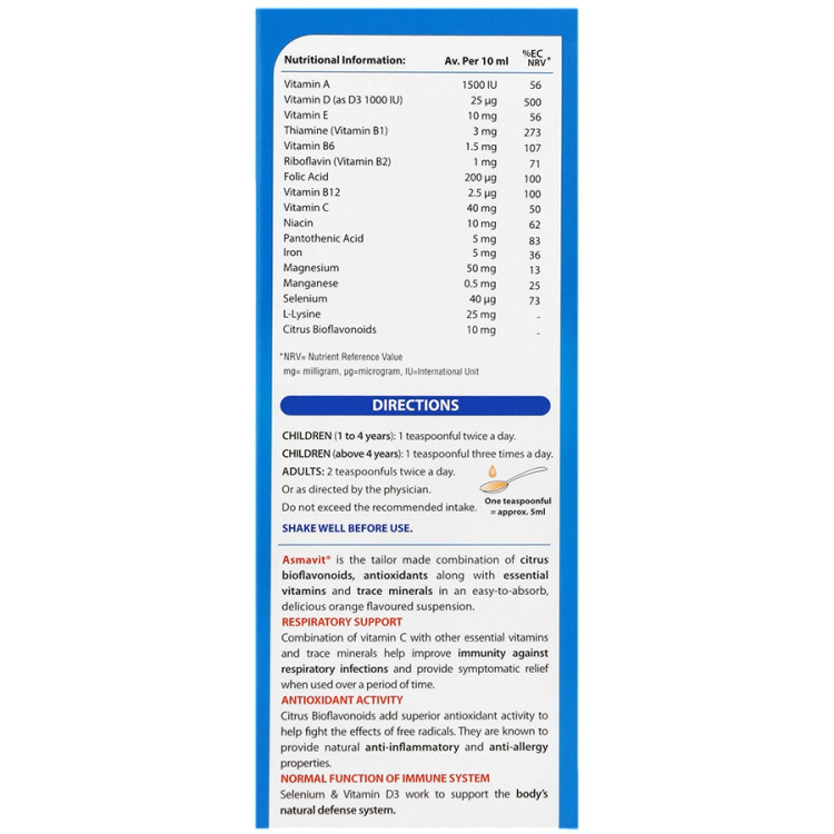 شربت آسماویت ویتابیوتیکس حاوی بیوفلاونیدهای مرکبات که به ویتامین P و یا سیترین هم معروف هستند به عنوان یک آنتی اکسیدان طبیعی عمل کرده که با از بین بردن رادیکال های آزاد باعث تقویت قدرت تنفسی در کودکان و بزرگسالان می شود. همچنین بیوفلاونیدهای مرکبات به همراه ویتامین C باعث بهبود گردش خون در مویرگ ها و رفع انقباضات نای و نایژه ها می شوند.