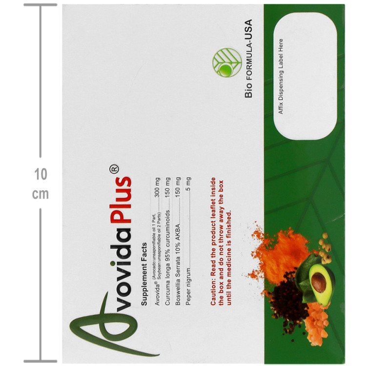 آوویدا پلاس، فرآورده گیاهی به شکل دارویی کپسول است که به عنوان غضروف ساز برای سنین بالای 18 سال کاربرد دارد. آوویدا پلاس حاوی عصاره غیرصابونی روغن آووکادو و دانه سویا با نسبت 1 به 2، عصاره زردچوبه، کندر و فلفل سیاه است و علاوه بر کمک به تقویت مفاصل و بازسازی و ترمیم غضروف های تخریب شده، به بهبود خشکی و انعطاف پذیری مفاصل و کاهش الهتاب مفاصل نیز کمک می کند.