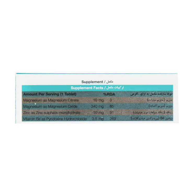 - حاوی منیزیم استئارات، منیزیم اکساید، زینک سولفات مونوهیدرات و ویتامین B6
