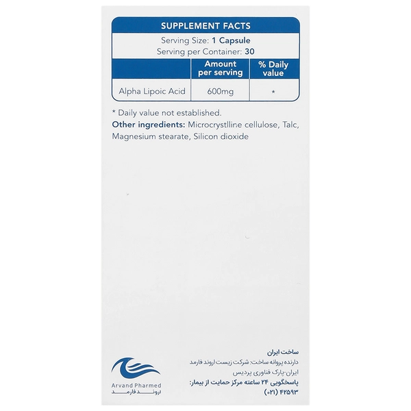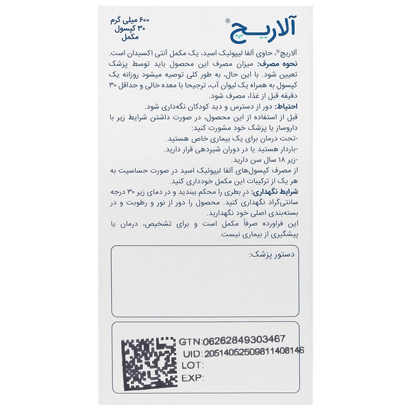 - آلاریچ مکمل غذایی حاوی 600 میلیگرم آلفا لیپوئیک اسید به ازای هر کپسول