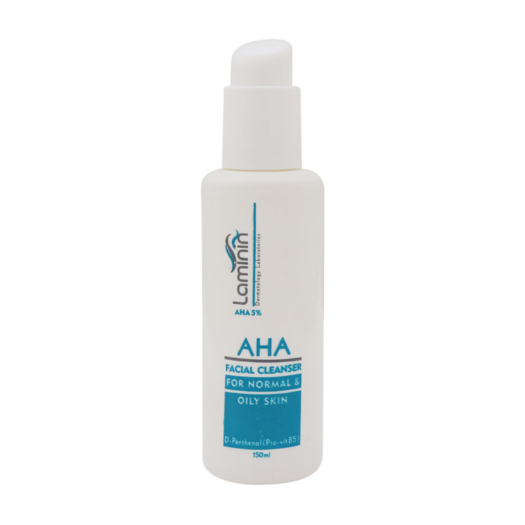 ژل شستشوی صورت AHA ۵ درصد لامینین با بهره مندی از ترکیبات ویژه خود از جمله آلفا هیدروکسی اسید به خوبی سطح پوست را از وجود لایه های مرده، آلودگی و چربی اضافی پاکسازی نموده و سبب روشن و شفاف تر شدن پوست می شود. پس از شستشو صورت با استفاده از این شوینده پوست چرب، منافذ مسدود شده پوست، باز شده و با دریافت اکسیژن به افزایش جریان خون زیر پوست کمک می نمایند. بنابراین پوست شاداب تر شده و از ایجاد جوش و تولید چربی اضافه جلوگیری خواهد شد.